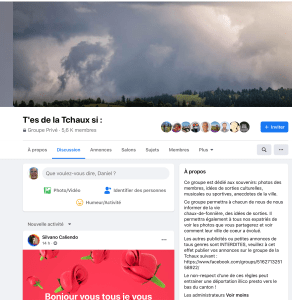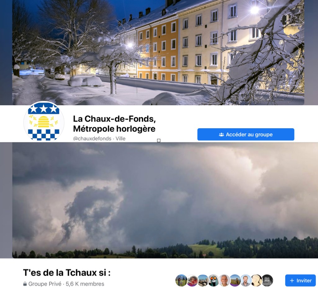 Celle de T’es de La Tchaux… si est beaucoup plus simple : « Ce groupe est dédié aux souvenirs : photos des membres, idées de sorties culturelles, musicales ou sportives, anecdotes de la ville. Ce groupe permettra à chacun de nous de nous informer de la vie chaux-de-fonnière, des idées de sorties. Il permettra également à tous nos expatriés de voir les photos que vous partagerez et voir comment leur ville de coeur a évolué« .