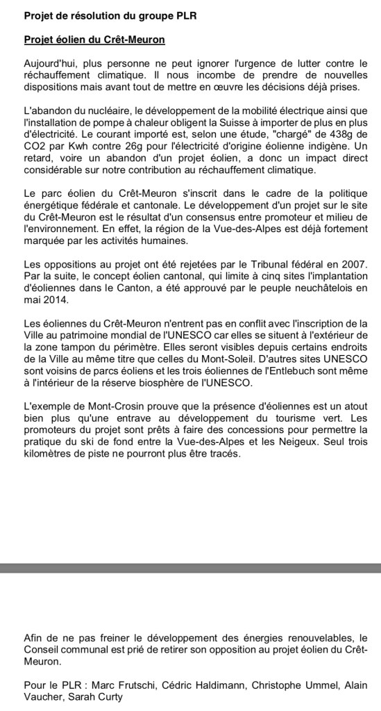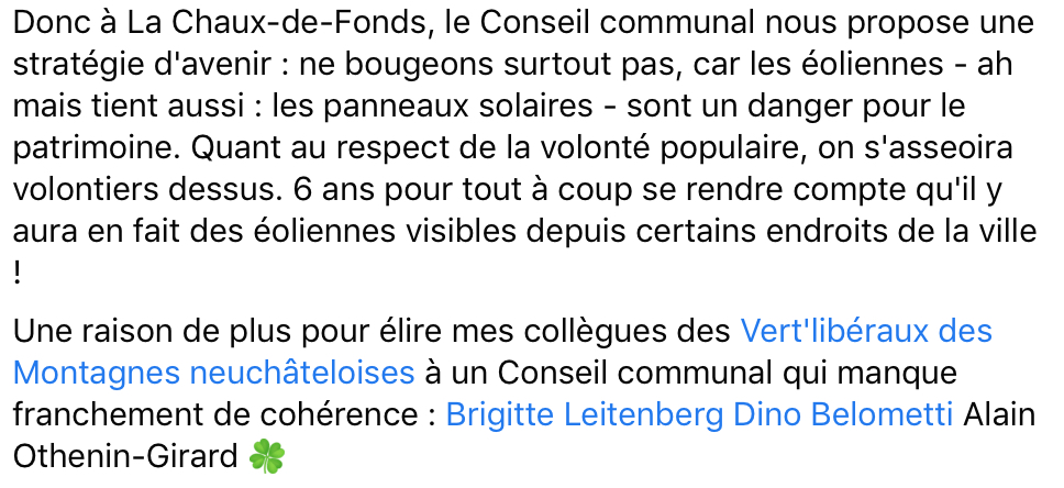 Les Verts libéraux chaux-de-fonniers ne se sont pas encore exprimés publiquement sur la question mais on les attend au contour, surtout qu’un de leurs collègues du Bas, le cher Maxime Auchlin, le 18 août, n’y va pas avec le dos de la cuiller pour les soutenir.