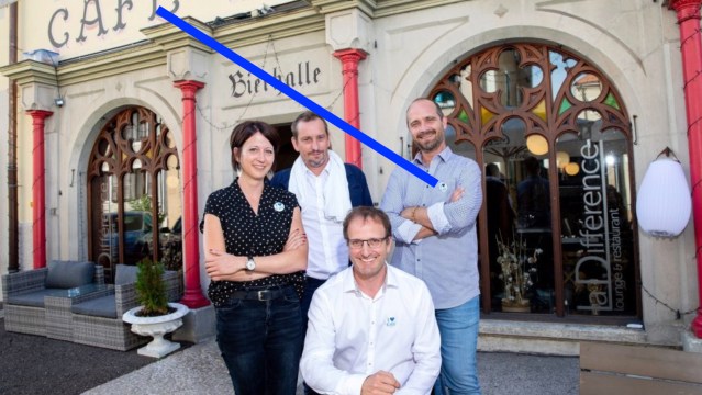 Les PLR ont choisi l’anglais pour leur badge (I ❤️ CDF), un « café« , La Différence (d’avec le Petit Paris, bien français) pour leur stamm, une ancienne Bierhalle à l‘allemande.