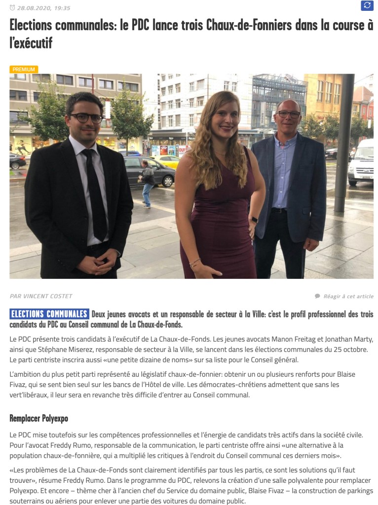 Le PDC a annoncé qu’il présenterait trois candidat-e-s au Conseil communal : Madame Manon Freitag, avocate stagiaire à l’étude de Me Freddy Rumo, chargé de communication du parti; et Messieurs Jonathan Marty, avocat à l’étude d’avocat-e-s NVB (Nicati, Vara, Bigler, Bonadei, Leuenberger), et Stéphane Miserez, collaborateur au service des Espaces publics en tant que menuisier.