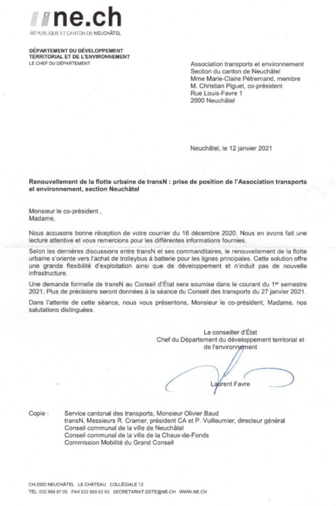 En allant consulter ce matin le site internet cantonal de l’Association transports et environnement (ATE), nous sommes tombé sur une lettre du Conseiller d’État Laurent Favre, datée du 12 janvier et mise en ligne, donc publique.