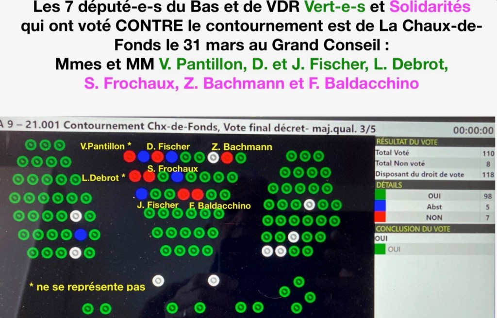 Le député chaux-de-fonnier Marc Fatton, en son nom personnel, a su devant ses pairs expliquer son dilemme cornélien. Comme Chaux-de-Fonnier, il ne pouvait pas voter contre le contournement; comme Vert, il ne pouvait pas approuver un crédit à rebours de ses convictios écologiques. Il s’est courageusement abstenu et est l’un des quatre députés masculins sur dix-neuf ayant survécu à la vague violette.