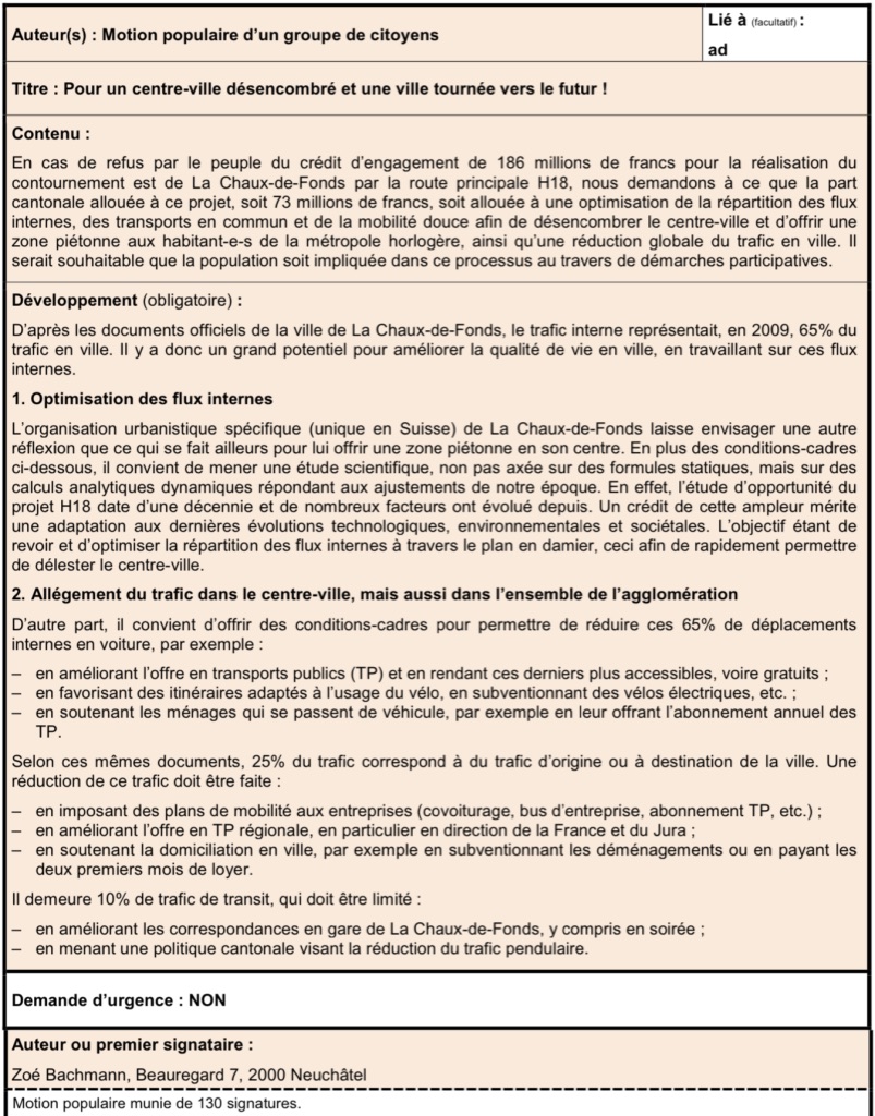 Cette motion voudrait que « la part cantonale allouée à ce projet, soit 73 millions de francs, soit allouée à une optimisation de la répartition des flux internes, des transports en commun et de la mobilité douce afin de désencombrer le centre-ville et d’offrir une zone piétonne aux habitant-e-s de la métropole horlogère, ainsi qu’une réduction globale du trafic en ville ».
